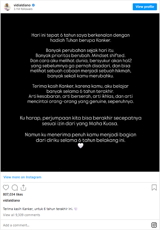 Unggahan tersebut saat itu mendapat banyak dukungan dari penggemar yang terus memberikan semangat agar Vidi tetap kuat menjalani pengobatan.