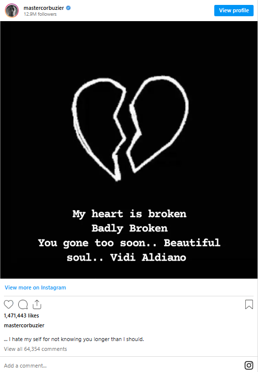 Ia juga menyertakan gambar berlatar hitam dengan ilustrasi hati yang terluka serta tulisan yang menggambarkan kesedihan atas kepergian Vidi Aldiano.